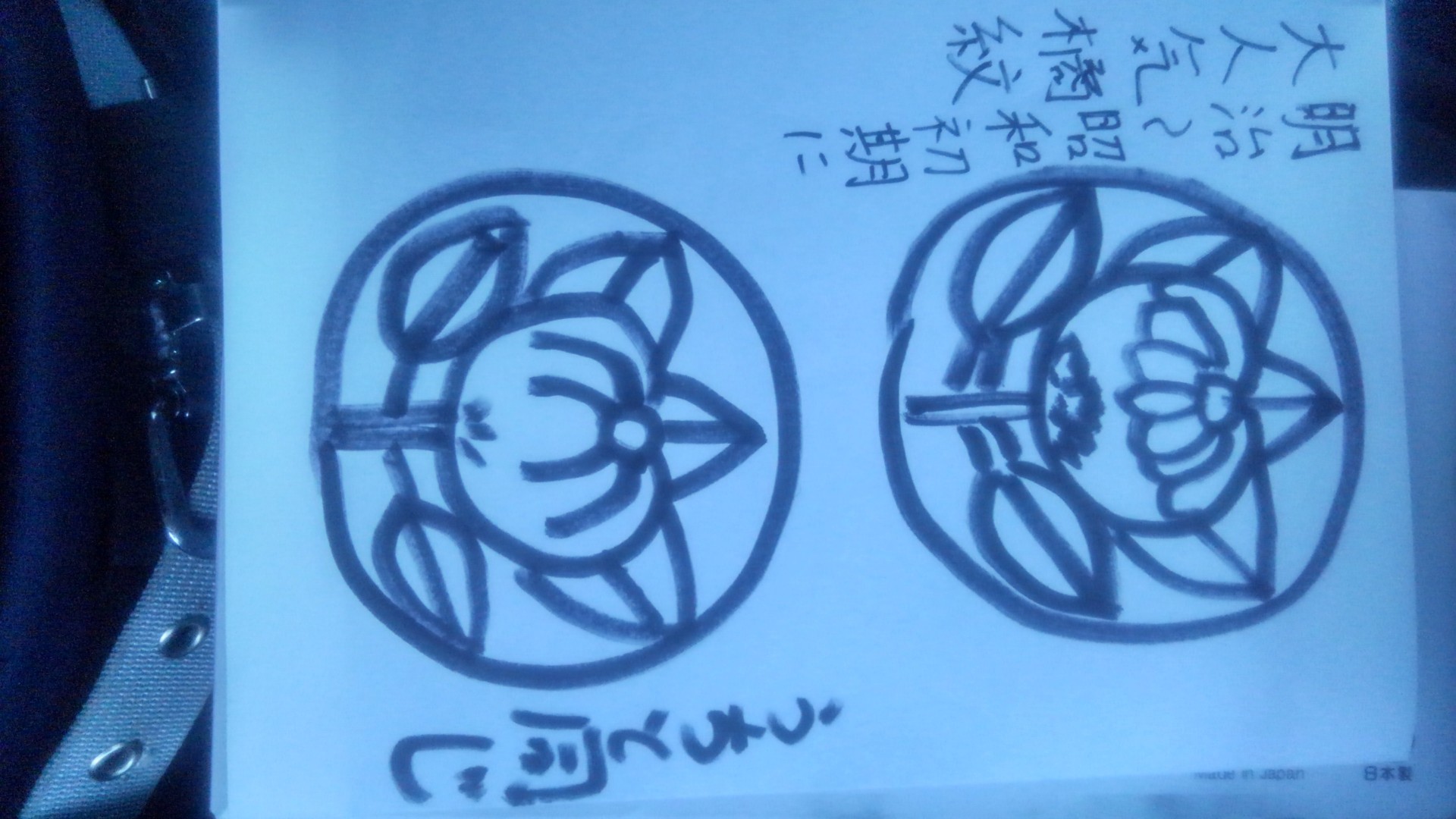 松平主殿頭様の副紋です。上は江戸時代の絵、江戸橘ですね。下は明治時代の絵、菊橘です。